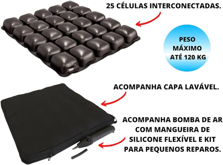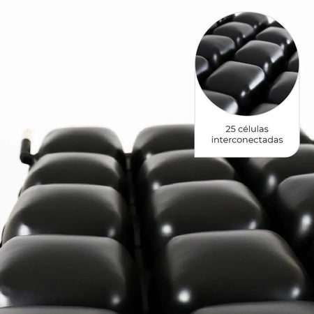 Possui tecnologia de células de ar interconectadas que regulam e transferem ar de uma célula para a outra, equilibrando o peso do corpo uniformemente, sendo superior às almofadas piramidais (também conhecidas como almofadas caixa ou casca de ovo). É impermeável, resistente e acompanha capa lavável em máquina de lavar.