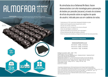 A Almofada com Células de Ar modelo Air Basic Dellamed foi desenvolvida para prevenir e minimizar picos de pressão que podem ocasionar lesões (escaras) no paciente. Esta almofada antiescaras inflável é ideal para uso no assento de cadeiras de rodas e para pessoas que passam muito tempo sentadas, pois proporciona o alívio de pressão sobre as regiões de apoio.