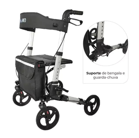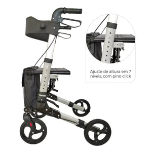 O Andador adulto em Alumínio D14 é a escolha ideal para quem busca mais conforto e comodidade para auxiliar na sua mobilidade. É extremamente leve, resistente e dobrável, facilitando o transporte. É o único do mercado que conta com porta bengala ou guarda-chuva e olho de gato frontal, trazendo mais segurança ao ser utilizado na rua. Tem ajuste de até 7 posições de regulagem de altura. Além disso, conta com uma bolsa para armazenamento de documentos ou objetos no encosto.