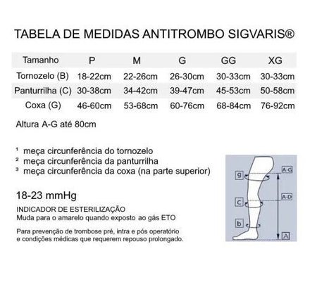 Afim de garantir a segurança dos pacientes, a Sigvaris fornece meias Antitrombo totalmente Esterilizadas com Oxido de Etileno. Está disponível nas opções meia coxa e panturrilha e é adequada aos pacientes que passaram por cirúrgicas com duração acima de 2 horas os quais necessitam de prevenção contra a Trombose e a Embolia Pulmonar.